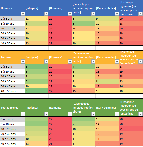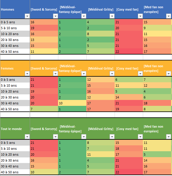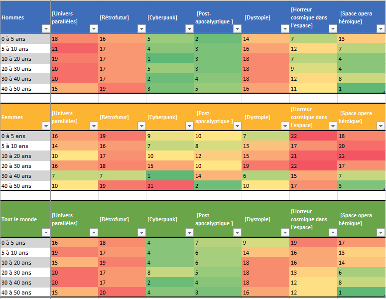 - Puis d’établir un classement des genres à l’intérieur de chaque groupe. Le rang n’est pas trop affecté par le nombre de répondant. Disons, un peu moins : il suffit parfois de 3 à 10 passionnés d’un genre pour faire bouger d’une à trois places quand les classements sont serrés. Cela se voyait déjà dans le précédent article. Dès lors, quand on voit un passage ponctuel de « 6 à 8 », ça risque d’être une simple fluctuation non signifiante. Les rangs sont associés à des couleurs : le 1 (premier) est toujours vert profond et le 22 (dernier) en rouge profond.