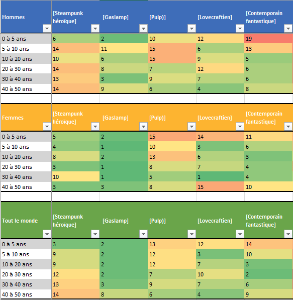 Gaslamp s’en sort très bien, et est même franchement réclamé côté femmes. C’est LE genre en concurrence avec le médiéval fantastique épique ! Je vous laisse apprécier les résultats, sur la base de 4 points pour « j’adore, j’en veux plus » et 2 points pour « j’aime ».