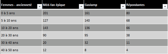 J’ai trié les réponses par durée de pratique du jeu de rôle, puis par genre. Enfin, j’ai rassemblé toutes les données (hommes, femmes, ne se prononcent pas) dans un bilan.